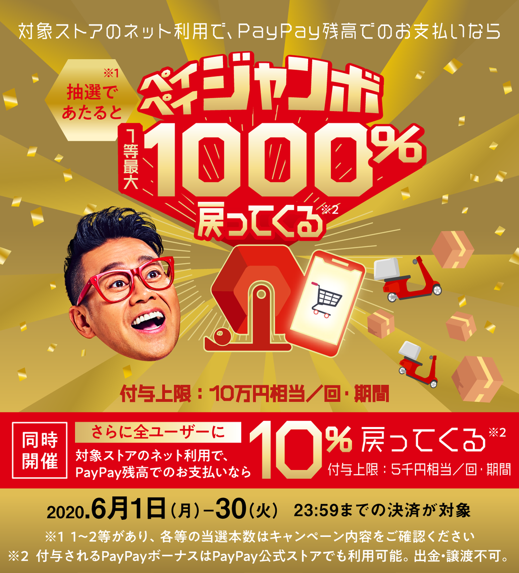 キャンペーン対象の加盟店(オンライン)で、キャッシュレス決済サービス「PayPay」を使って支払うと、抽選で決済金額の最大10倍(1,000%)のPayPayボーナス(付与上限:100,000円相当/回および期間)が付与される